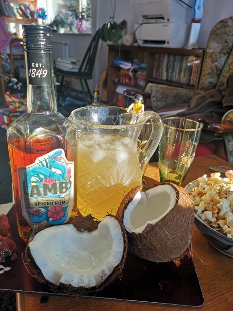 장보러 나갔다가 코코넛을 충동구매했던 어느 날이었습니다... 이걸 어쩌지 하다가 결론은 역시! 술이었지요. 럼주를 사서 설탕 시럽 만들어 넣고 찬장 뒤져서 바닐라 시럽도 넣고 해서 마셨습니다...
