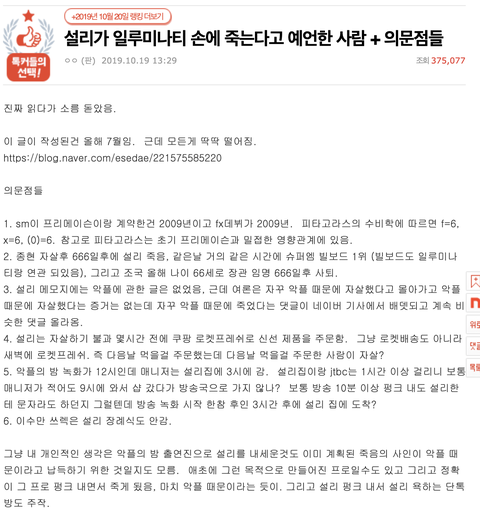 개소리로 들릴수 있지만 고인모독이 아니라, 진짜 만약에 설리가 억울하게 죽은거라면? 자살당한거라면?