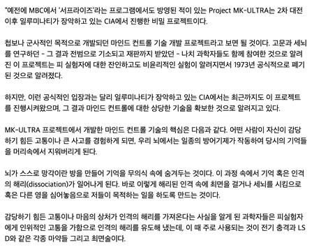 1. 일단 일루미나티 소속인 cia가 예전에 실행한 프로젝트가 mk 프로젝트라고 사람의 자아를 분리? 시켜서 정신이상 상태로 만드는 프로젝트인데 mk 프로젝트 실험에 사용된 사람들이 해리성 정체성 장애 앓게 되는데 설리 마지막 곡이 해리성 정체성 장애 가진 아이에 대한 곡이기도 하고