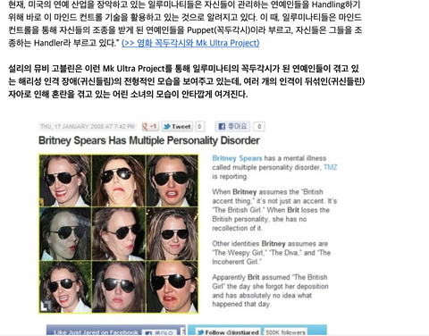 해외에서도 언론에서 보도 된적도 있었고 브리트니 스피어스가 자기가 뭐라고 얘기했는지 까먹는거나 케이티 페리가 콘서트에서 쓰러지면서 "master i am sick"이라고 했고 칸예웨스트도 콘서트에서 일루미나티 언급하고 정신병원 감금됨, 마이클 잭슨 일루미나티 언급하고 얼마뒤 죽음, 짐캐리 방송에서 일루미나티 대놓고 언급하고 여친 자살하고 폐인됨. 소아성애자 천지인 일루미나티 그리고 할리우드의 진실의 보여주기 위해 저스틴 비버가 yummy라는 곡을 냄
