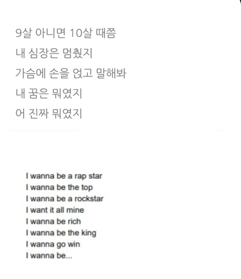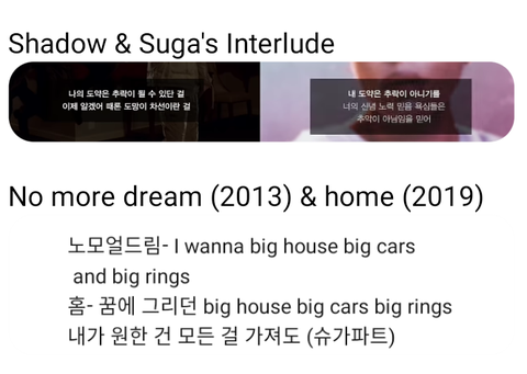 위에가 O!RUL8,2 가사 밑에 진한 가사가 shadow 가사야. 꿈이 뭐였지? 라고 물었는데 슈가가 꿈이었던걸 7년만에 다시 답해줘서 이어지는 거지.