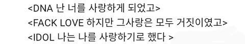 DNA - fake love - Idol 이 순서로 연결되는 앨범과 곡 해석 짤임.