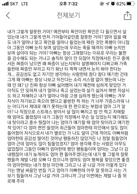 나는 초등학생 때 부부싸움 보면서 컸고 중학생 때는 아빠한테 가정폭력을 당하면서 살았어 집에 늦게 들어왔다는 이유로 머리카락도 잘리고 얼굴은 알아볼 수 없을 정도로 맞았는데 너무 무서워서 아빠를 경찰에 신고했어