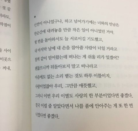 약속시간 훨씬 전에 오빠 집 앞으로 갔어 좀 일찍 가서 내가 하고 싶었던 말 정리하고 있으려고 했는데 오빠도 일찍 나와 있더라고 멀리서 실루엣만 봤는데도 눈물날 만큼 좋아하는데 헤어지자고 말할 수는 있을까 싶더라