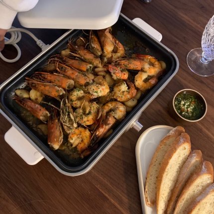 3. 블랙 타이거 새우 감바스. 미리 편마늘이랑 새우 껍질로 약불에서 뭉근하게 끓였어요.약불로 오래하면 풍미가 대박입니다. 블랙타이거 새우를 넣고바베큐 솔트 ? 럽같은 다양한 향신료들어간 소금을 넣었떠니아 맥주 안주 필살기가 나왔어요.