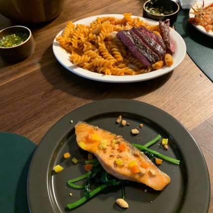 2. 연어 스테이크 + 시금치 + 레몬 소스, 푸실리 로제 등심 스테이크 파스타