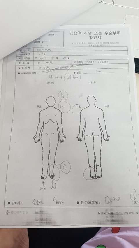 하지만 병실로 와서 애기 상태를 보니 왼발에 양말 그대로 신겨져 있고 오른발에 붕대가 감겨져 있어 너무 놀라 왼발 양말 벗겨 보니 왼발은 수술도 안한 수술실 들어가기전 이랑 똑같은 상태였고 간호사실에 수술 부위 재 확인했으나 왼발 수술 맞다고 하며 수술실 들어가기전 애기 왼팔에 왼쪽 수술 인식표까지 부착하고 수술실 들어간거 확인.
