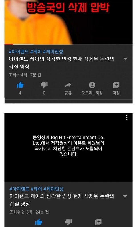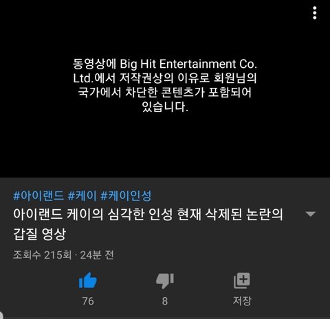++)댓글에서 퍼왔습니다 빅히트 측에서 케이의 논란에 대한 유튭 영상을 10분만에 정지시켰다가 들키자 다시 풀어줬다고 하네요..