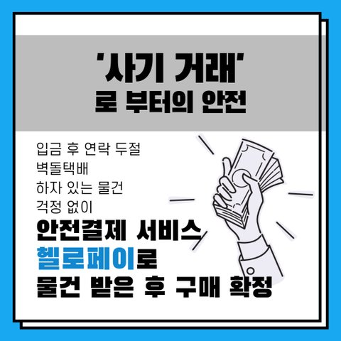 또 요즘에는 코로나 때문에 택배로 거래하는 경우가 많으실 텐데, 사기택배를 받을까 걱정하지 않아도 돼요! ‘헬로페이’라는 안전결제 서비스가 있어서 본인이 주문한 상품이 맞는지 택배를 받은 후에 결제를 확정하는 시스템이라 사기 걱정은 절대 안 해도 된답니당 결제금액은 헬로페이에 보관한 뒤 확정하면 보내져요!