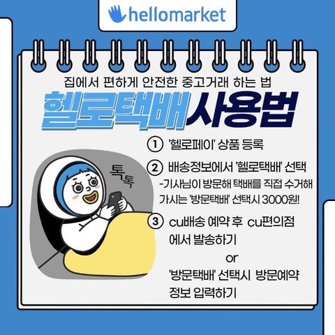 특히 제일 알려주고 싶은 서비스는 이번 주 16일에 오픈하는 ‘헬로택배’랍니다!! 헬로택배는 지역/무게/크기 상관없이 택배비가 무조건 2000원!!!! CU에서 예약하고 직접 보내거나, ‘방문택배’를 이용할 수도 있는데 방문택배는 단돈 3000원에 택배기사님이 직접 집으로 찾아오셔서 택배를 수거해 가시는 서비스!! 무거운 제품이나 제주도 등에 보낼 때는 택배비 때문에 거래 못 했던 분들 많았을 텐데 이젠 맘껏 거래 해도 돼욧~~~~ 그리고 택배비는 자동으로 정산 되어서 따로 편의점에서 결제하거나 기사님께 지불할 필요가 없고 자동으로 상품 금액에서 빠져나가서 편하답니다!! 진짜 헬로택배가 중고거래 하는 데 있어서 좋은 조건이 될 것 같아요 후후 저도 택배비 때문에 중고거래 하기 망설여질 때가 많았거든요~~~