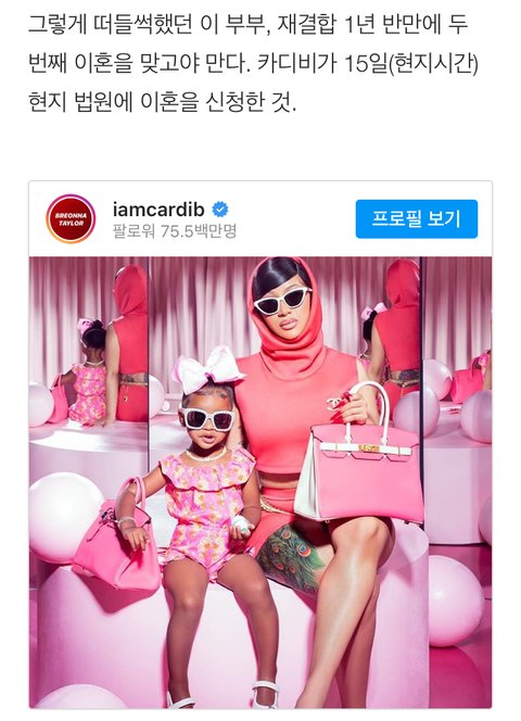 저번에 오프셋이 바람펴서 한번 이혼했다가 재결합해서 잘 살고있었는데 더는 돌이킬 수 없는지경까지 갔다고 이혼신청했대 카디비 딸이랑 햄보카길