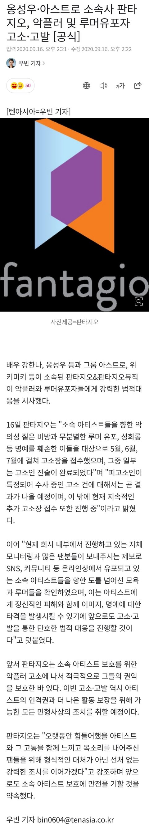 옹성우 아스트로 소속 판타지오 고소공지