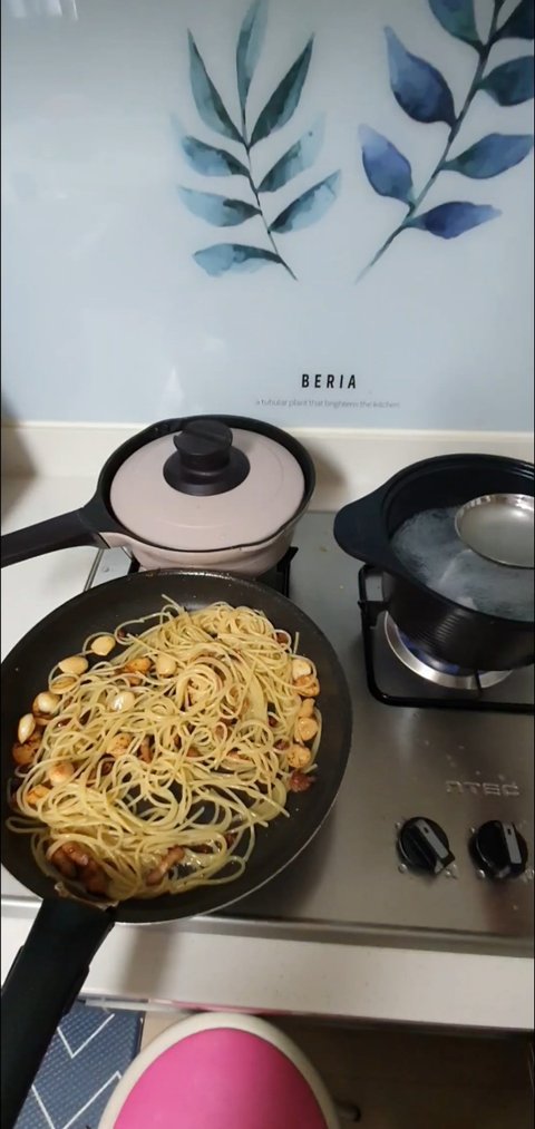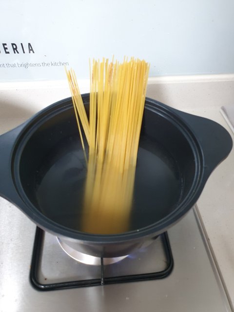냄비에 들어갈때까지 반복한다. 집게로 눌러 면이 물속으로 잠기면 놔둔다.(9~10분)