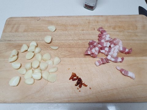 2-1) 마늘과 페퍼론치노는 2등분한다.(마늘을 4등분 이상 하면 두께가 얇아져 쉽게 타버린다.)