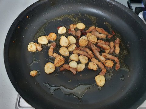 3-2) 마늘 향이 올라오면 삼겹살, 페퍼론치노를 넣고 볶는다.