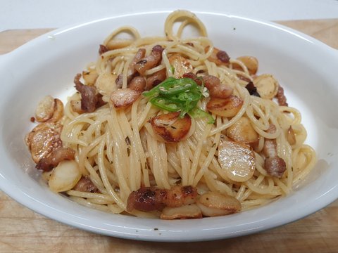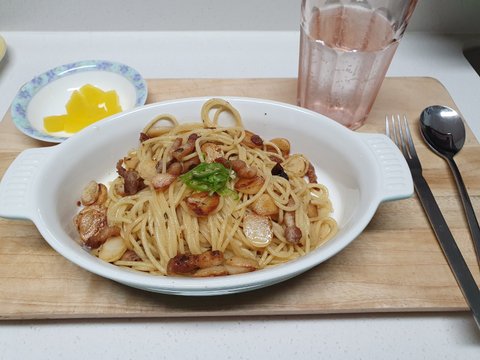 5. 완성된 알리오 올리오 파스타를 접시에 담아 먹는다.