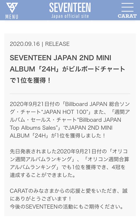세븐틴 오리콘 주간 차트 4작품 연속 1위로 일본 기준 해외 남성 아티스트 중엔 최초 기록이었잖아!