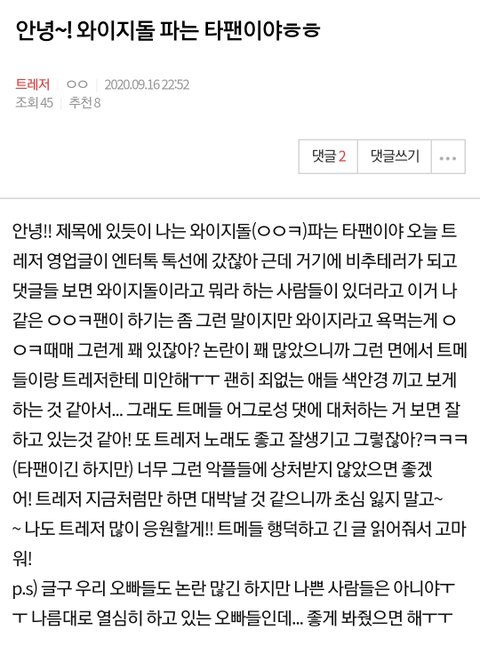 밑댓말처럼 아이콘 한테 오빠라고 하는것도 의심스럽고 굳이 욕먹는걸 우리탓으로 돌린다고..? 아니 그렇대도 어떤 미친 팬이 굳이 남의 팬톡가서 자기 가수 이미지 떨어트리는 행동을해? 그냥 가서 같은 와지끼리 잘해보자 이런식의 글은 올린다쳐도 저건 아니지 ㅋㅋㅋ완전 팬코다 저건