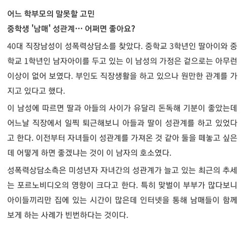 나 어릴때 오빠랑 옷벗고만지고그랬음 진짜..나살면서 한번도 남에게 말안꺼냈는데;; 오빠랑 2살차인데 내가 성의 개념을 모르는 초딩저학년일때 오빠랑 둘이있으면 밤에 옷벗고 뽀뽀하고 몸만지고 그랬음 아나ㅠㅠㅠㅠ 진짜 지금생각해도미쳤는데 부모님이 일때문에 우리남매 신경 잘 못 쓰셨거든 몇번그러다가 그뒤로 오빠가 하자고안하더라? 이게 잘못된거라고 깨달은건지뭔지ㅋㅋㅋㅋ 아..지금은 오빠가 하도엄마아빠속썩이고 날라리들이랑 어울려다녀서 나랑도 서먹서먹한데 옛날에 오빠랑 그런짓했다고 생각하니깐 ㅏ좀 ㅈ같고 이상함;;;;;ㅅㅂ;;