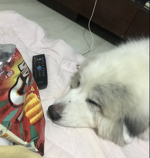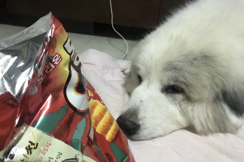 뒷쪽에 누워있다가 과자 먹고 있으니깐 어느순간 슬금슬금 와있어서 안돼! 하면 자는척함