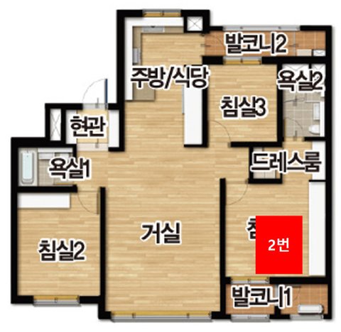 풍수상은 2번이 맞긴한데 쓰니네는 붙박이장으로 인해서 1번이 이상적인 배치이긴합니다