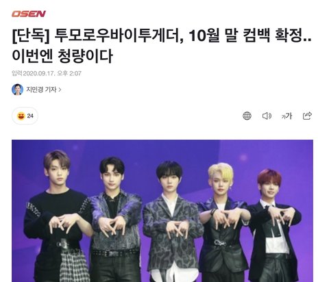 투바투 컴백 ㅊㅋㅊㅋ 기사 https://n.news.naver.com/entertain/article/109/0004274932