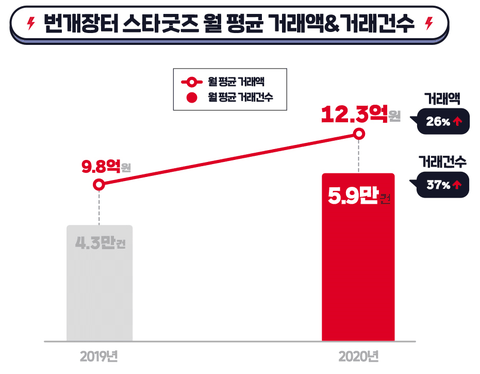 2020년 1월부터 8월까지 번개장터에서 거래된 방탄소년단 굿즈는 16만 건, 약 37억 원에 달하는 거래액을 기록하며 스타굿즈 카테고리 내 압도적인 우위를 보였다. 이는 카테고리 내 두 번째로 많이 거래된 아이즈원의 4배가 넘는 수치다. 방탄소년단 굿즈 중에서는 포토카드가 5만 1천 건으로 가장 많이 거래되었고, 앨범, 엽서가 뒤를 이었다. 네 번째로 많이 거래된 방탄소년단 굿즈로는 구하기가 ‘하늘에 별 따기’인 것으로 알려진 공식 굿즈로, 7천 건이 넘는 거래 건수를 기록했다. 이 외에도 티머니, 배스킨라빈스, 칠성사이다, 스타벅스 등 방탄소년단과 브랜드 콜라보 굿즈들도 활발하게 거래되었다.