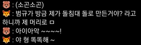 베댓 설명 ㅈ같네 진짜 ㅋㅋㅋㅋㅋㅋ 최연준이 속상했으면 애초에 이렇게 모아들한테 말 안하지. 본인이 괜찮다는데 왜 니들이 ㅈㄹ이냐 링크: https://twitter.com/7mulzomul/status/1306511737630334976?s=19 곰이 범규고 여우가 연준이임. 꼭 링크 들어가서 봐. 진짜 별 문제 없는 대화였고 갑분싸는 개뿔