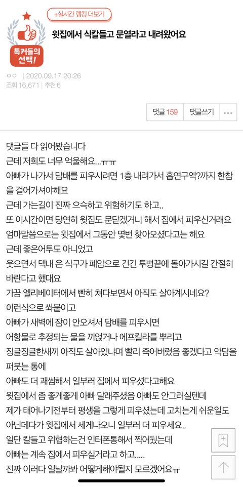 아, 윗집이 참다참다 못 참고 진짜 찌른다면, 저는 윗집 여자분에게 변호사 선임비 보태줄 의향 있고, 정당방위로 국민청원이며 이것저것 도와드릴 의향 있습니다.