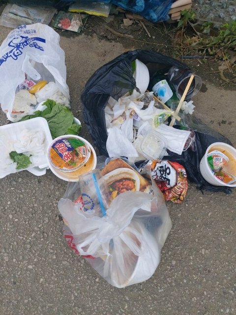 다른 식당 포장지들과 컵라면 마스크..이상한 쓰레기들과 함께...