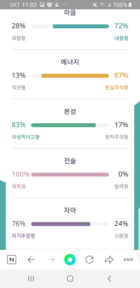 나를 예를 들어서 말하자면 나는 ISTJ인데 이 네 가지 성향 중에 J가 가장 강해서 100%로 나오고 애들이랑 얘기하다보면 진짜 애들이 나를 이상하게 보거든...