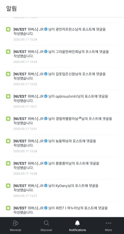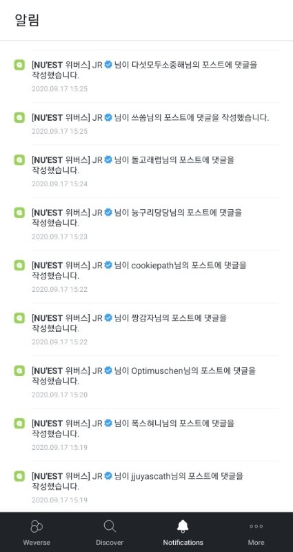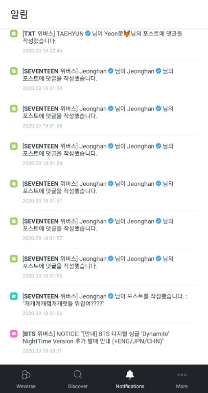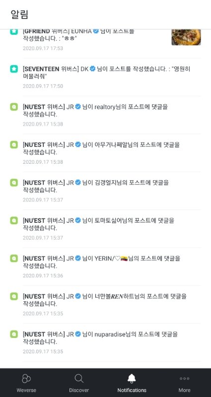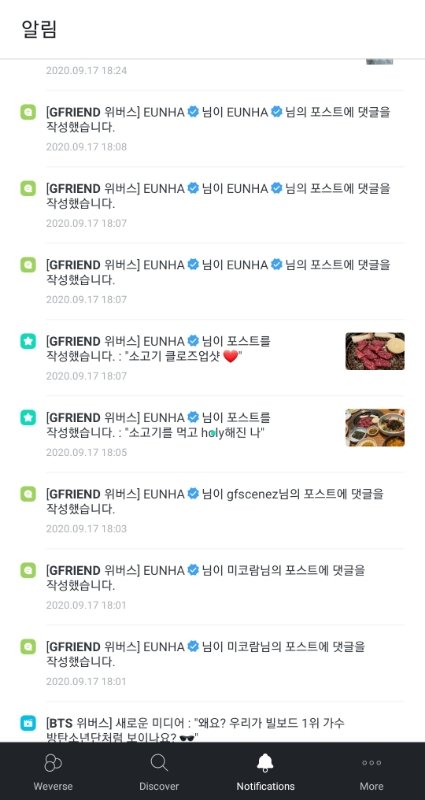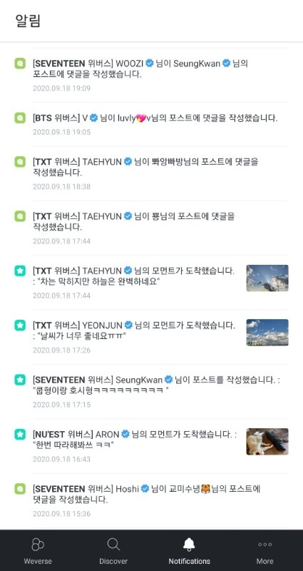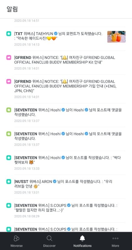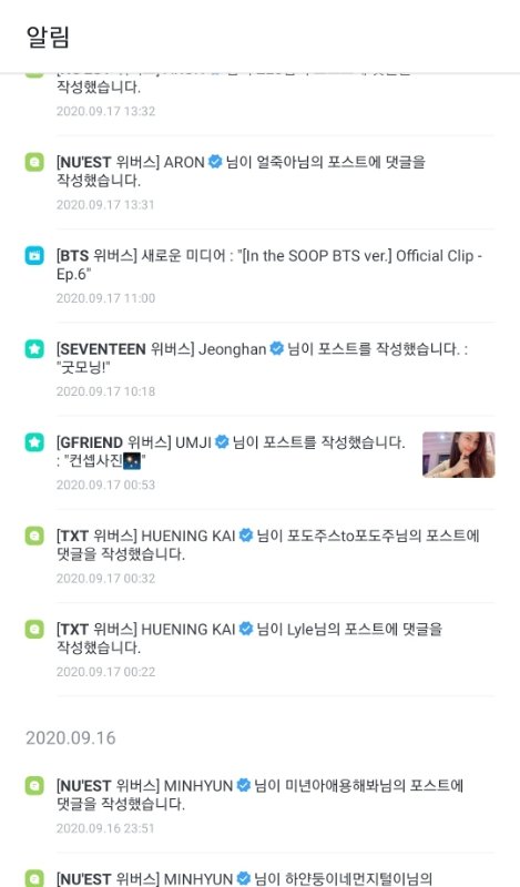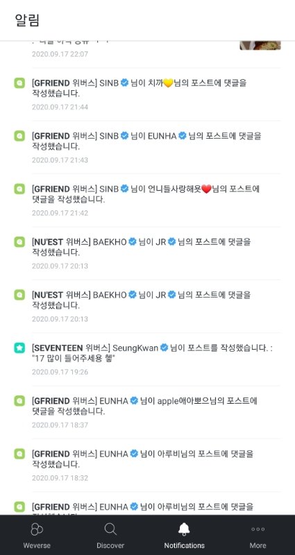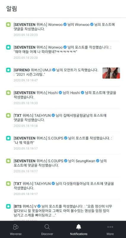 위버스에 있는 그룹들 소통은 잘해주지 않냐 방탄 투바투 여자친구 새븐틴 뉴이스트 다 아무리 바빠도 어떻게든 소통할려고 올려고 하는 것 같던데 (9월 17일~18일 소통 일부분)