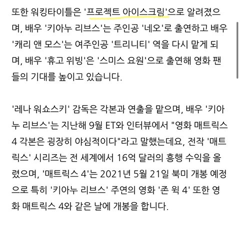 우리 세계관 얘기할 때 매트릭스 이야기 많이 하잖어,, 매트릭스4 워킹타이틀이 ‘프로젝트 아이스크림’이래..!!!! 진짜 매트릭스 컨셉인가 ,,, 주인공 이름도 네오야 ㅋㅋㅋㅋㅋ