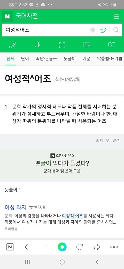 간단히 말하면, 내가 여기서 문제삼는 건 이걸 현교육과정에서까지 가르친다는거임 / 지식백과에도 실려있고.. 옛날 조선시대에는 사대부의 말투, 여성적 어조 물론 다 달랐지 이 점은 나도 충분히 인지하고 있음 .. 문제는 이 순종적이고 부드럽고 연약한 어조를 '여성적 어조', 강렬하고 굳센 어조(ex. 이육사의 절정)을 '남성적 어조'라고 규정하는 현 교육이 잘못됐다고 생각하는 거임.옛날에는 당연히 여성적 어조, 남성적 어조가 있었겠지. 근데 굳이 이걸 현대까지 와서 '여성적', '남성적'이라고 규정해서 가르친다? 대체적 표현이 있는데,,글쎄 ? 이게 낡은 관습일 뿐이며, 잘못됐다는 사실을 인지하고 가르치고 배우는 선생님들과 학생들은 괜찮지만, 아직 이러한 젠더개념을 잘 모르는 어린아이(내동생 어린데 국어가르치며 절실히 느낌), 혹은 문제삼지 않으며 지나가는 사람들한테는 세뇌가 돼서 현실 사회에 나와서 까지 "여자가 어디서~" "여자말투는~" 이렇게 되는 거임..