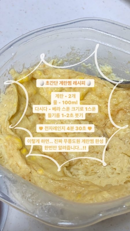 그리고 이 밑에 사진은 계란찜 레시핀데 유튜버 냔지님 인스타 스토리야 나 이렇게 한 번 만들어서 먹어봤는데 진짜 개존맛탱이여ㅠㅠㅠㅠ 참고로 나는 들기름은 없고 참기름만 있어서 참기름 넣어서 해먹어봤는데 그래도 진짜 맛있어!!! 굳굳