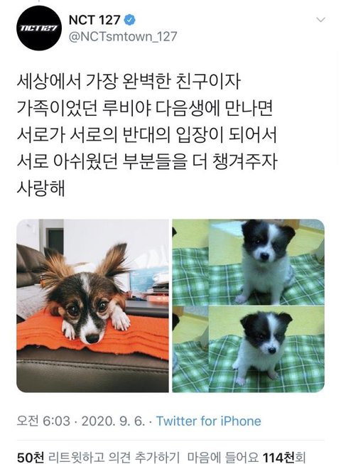 “다음생에 만나면 서로가 서로의 반대의 입장이 되어서 서로 아쉬웠던 부분들을 더 챙겨주자. 사랑해” 기회가 될때마다 팬들한테 항상 강아지 자랑하고 안부 알려준거 같은데, 저 글 보니 오래전에 무지개 다리 건넌 우리 강아지 생각나고 ... ㅠㅠ 강아지들은 다 천국 가는거 맞겠죠 ㅠㅠ 엔시티 태용 이 쓴 글이예요 13년간 키운 가족이랍니다