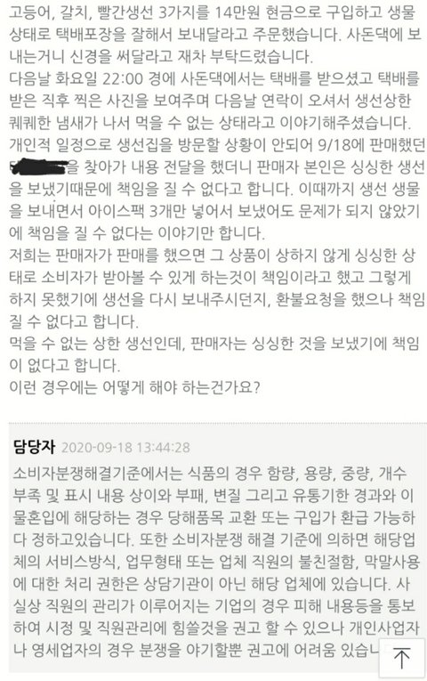 저희는 판매자가 판매를 했으면 그 상품이 상하지 않게 싱싱한 상태로 소비자가 받아볼 수 있게 하는 것이 책임이라고 했고, 그렇게 하지 못했기에 생선을 다시 보내주시던지, 환불요청을 여러번 했으나 책임 질 수 없다는 말만 반복합니다.