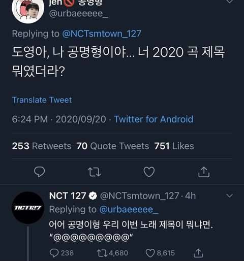 진짜 그 공땡 아이디로 공땡이님 언급하면서 신곡 제목 물어본 그 시즈니분은 정체가 뭐임??? 이게 가능해..? 우연의 일치였다면 진짜 너무 소름돋는다..... 그리고 눈치까고 센스있게 답장 남긴 도영이도 대단;