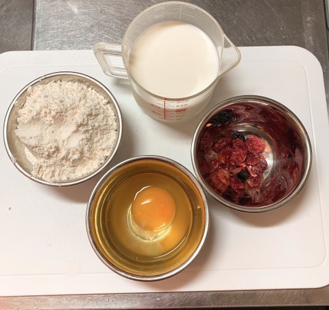 팬케익 믹스, 묵히고 있는 건 믹스베리, 계란, 우유반죽은 너무 묽게 하지않고 됨직하니 해준다.