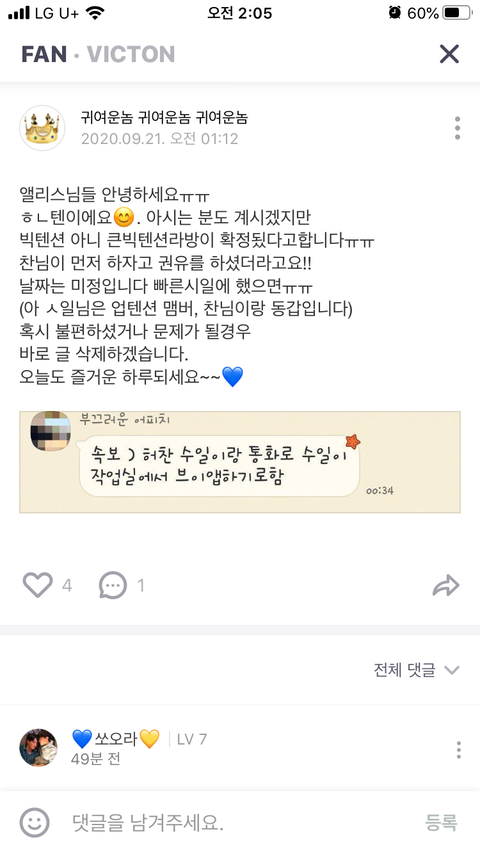 할 일이 꽤 있어서 찬이 브이앱 못 보고 스냥 앨리스들 반응만 보고 있었는데 오랜만에 브이앱 팬 게시판..? 그거 들어가 보니까 요론 글이 있더라..나만 처음 알았어,.?