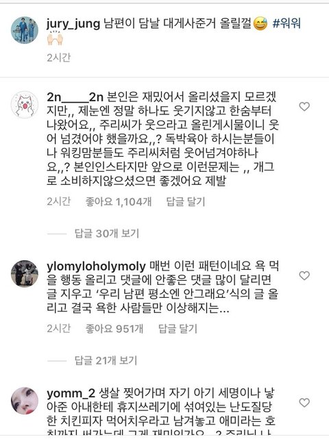 저게 싫은 이유는 정주리가 불쌍해서가 아님. 정주리가 남편에게 어떤 대접을 받던, 남편이 어떤사람이건 어차피 본인은 괜찮아보이니 동정도 안생기고 관심없음. 근데 저런취급 당하는걸 인스타에 올려 희화화한다는게 싫은거임. 자기 남편 또는 부인에게 저런식의 행동을 한다는게 비정상아님? 동물한테도 저렇게는 행동안함. 근데 그걸 인스타에 웃긴일화정도로 가볍게 생각하는게 싫음. ‘차라리 남편욕해주세요 남편이 뭘 잘못했는지 몰라요’ 라는 진지한 글이라면 이해라도 하지 그쪽 가정사에선 웃고 넘길일일지 몰라도 실제로 저런취급받고 사는 여자들을 불쌍하게 여기는게 아니라 우습게 만드는 행동일수도 있음. 그래서 대중들이 더 불쾌하게 생각하는것. 아무리 인스타가 개인공간이라지만 대중에게 보여지는 직업인만큼 웃고넘길 소재와 그렇지못한것 구분하시길 바람