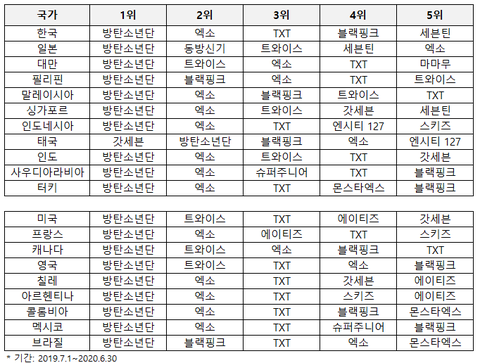새로 공개된 트위터 K-POP 관련 통계(집계 기간 2019.07.01 - 2020.06.30)