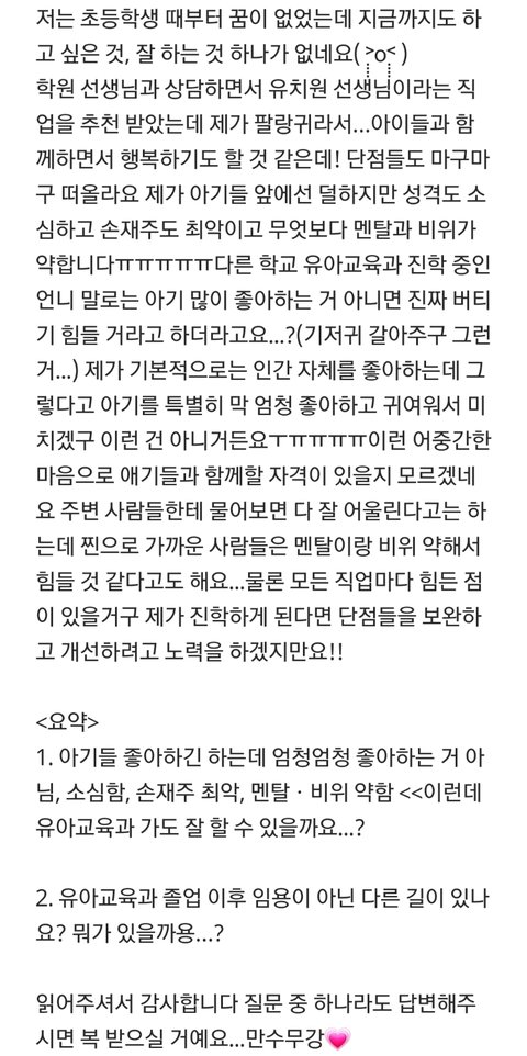 난 이런 애들이 제일 불안하고 짜증남 할거없어서 유아교육과 간다??? 누군갈 가르치는 행위자체도 힘든데 말도 제대로 못알아먹는 애기들 가르치는건 더욱 힘듦 진짜 어떠한 경우에도 아이들을 사랑하겠다는 의지 없이 단순히 할게없어서 저 직업을 가지니까 유치원 같은 시설에서 아동학대같은 말도안되는 일이 벌어지는거임 저밑에 무슨 임용붙으면 편하다 어쩌다 하는 댓글있는데 편하게 일하면 편해지고 힘들게 일하면 힘들어지는게 유치원 교사인데 교사가 편하면 편할수록 애들한테 신경안쓴다는 얘기고 힘들게 일할수록 애들한테 신경많이 쓴다는 얘기임 편하게 일하고 싶으면 제발 유교과 가지마라