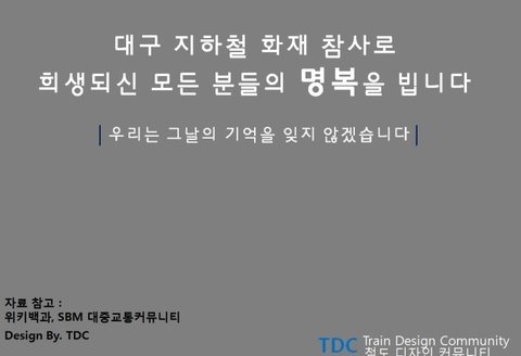 사고 한달 뒤인 2003년 3월 26일, 충남 천안초등학교 축구부 합숙소에 큰불이 나 부원 9명이 숨져 슬픔에 또 빠졌다. 그러나 해당 사건과 달리 금세 잊혔다.대구 지하철 참사로 인해 지하철에 대한 부정적인 인식이 커졌다.[30] 이 때문에 지하철을 도시철도라는 새로운 이름으로 변경하는 계기가 되었다.일간베스트 저장소나 디시인사이드 등지에서는 대구를 비하할 의도로 불에 탄 사건희생자들을 통구이로 빗대거나, 사건용의자인 김대한을 통구이요리사인 머한셰프라 지칭하는 고인 모독 발언과 지역 비하 발언을 했었다. 제너럴 조와 같은 맥락이다. 보수성향이 강한 대구에 대해서도 지역비하와 고인드립을 자행하는 모습은 일베저장소가 보수와는 관련없는 막장 패륜사이트일 뿐이라는 것을 알 수 있게 해주었다.2014년 극우 유튜버 윾튜브로 잘 알려진 극우 페이지 유머저장소가 과거 일베의 통구이 발언에 동조하여 타요전철 드립을 친 것이 밝혀져 큰 논란이 되고 있다.&lt;img class='wiki-image' width='100%' src='//ww.namu.la/s/4bfe18731cac6143cda30eec93d1bea188cbfbef8f79693e6ac099db93f1352d8b71f78c2a73a4bf6463b5d9287e6de1a51fc2c550be86ab6cae6776b57b056bf3bca84c21fe6812328fb04773b97598bc7dccf8794c9d9a768d8057961c6ed87d56088f8fa6b5d6c04e1db48c7b349e' alt='파일:풍동(윾튜브) 대구 지하철 참사 비하.jpg'&gt;