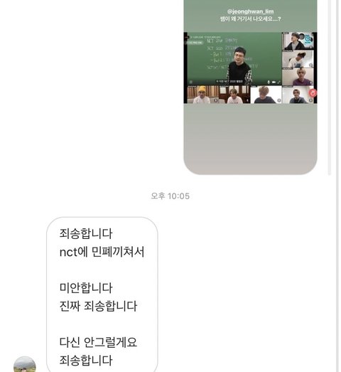 뭐라 하는 줄 아셨나봐...당황해서 답장하는게 아닌 전에도 뭐라하는 디엠이 많이 와서 당연하게 사과하신 느낌...시즈니 중에 정환쌤 안좋아하는새럼 없는데요ㅠㅜ