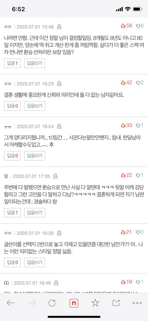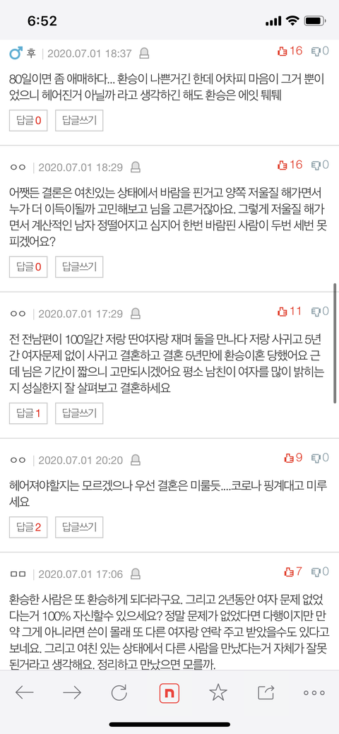 사진과 같이 “이런남자랑 결혼을 하면 안된다” “또 환승할거다” “믿음이 바탕되어야 하는데 신뢰가안간다” 등등이요.