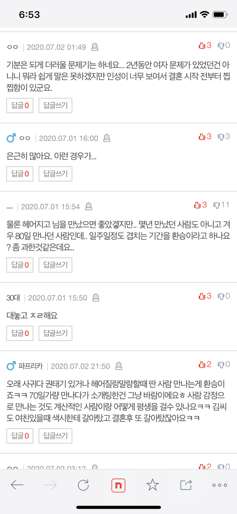 “아마 헤어지지 않을것이다” “그정도가 뭐 환승이라고 그러냐” “그냥 사랑이 아니였기에 간거다” “10일정도 겹친거고 정식 사귀기 전에 잠자리라면 신경안쓸거다” 등등 대부분