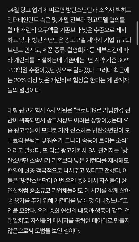 2년전에 티비에서 방탄 광거료가 30억이라는 말이 있었음. 최근까지는 백퍼 50억선이었을 거임. 그리고 핫100 1위 찍으면서 몇십억은 더 오를 예정이었을테고. 그런데도 광고료 10억을 낮춰준거네