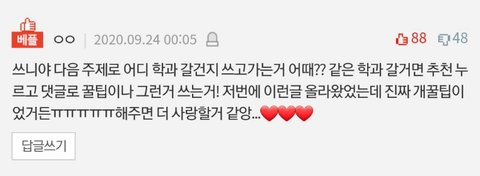 오늘도 이전글애서 추천받았던 주제 가져와봤어! 다들 댓글 많이 달아주라❤ 그리고 아래 사진에 댓쓰니가 말해준것처럼 자기가 원하는 학과에 추천 누르고 그 댓 답글로 꿀팁같은거 쓰면 좋을거같아!! 마지막으로 혹시 보고싶은 주제 있으면 댓글로 적어줘! ฅ^._.^ฅ