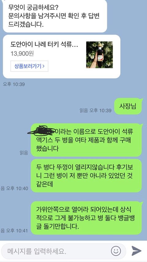 그런데 이 전에 시킨 적 없던 석류액기스를 두 병 사보았는데, 뚜껑이 안열리고 헛도는 겁니다. ㅋㅋㅋㅋㅋㅋㅋㅋㅋ두 병 다 그래요. 유리병이라 뭐 자를수도 없고..물론 비싼 제품은 아니지만 판매자에게 문의를 하였습니다.